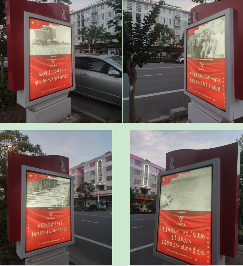 这些灯箱中,广告灯箱的一面看到统一印制的建党百年历史的画面外,在灯箱的另一面,除了印制江苏农垦统一的LG标识和“不忘初心 继续前行”“军垦精神 薪火相传”的细小字体外,还分别印有农建四师将士在农场“三大战役”进程中开垦建设的不同老照片附说明,印有不同风格的军垦传统文化标语,并在画面外的框架上,安装了镶嵌在其上的军垦传统文化的标志,浓郁的军垦传统文化在广告灯箱中的完美组合,让仍健在的老军垦们甚是激动,说农场党委以这种方式宣传弘扬军垦传统文化,这是对他们建设农场最好的肯定。