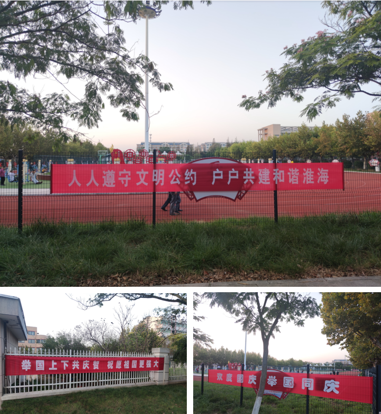 五星红旗随风招展,喜悦之情更是承载着人们对美好未来的向往。辖区升挂的国旗,悬挂国庆标语,文广苑楼体上“人民有信仰 国家有力量 民族有希望”等主题宣传标语等格外醒目,加上农场在各个广场上开展的群众性文化体育活动及广大职工居民进行休闲健身的镜头,既呈现出了淮海职工居民在祖国大家庭怀抱里安定团结祥和的良好社会氛围,也再一次激发着农场广大党员干部和职工群众对党、对祖国母亲的无尽热爱,昭示着广大干部群众在中国共产党的领导下,感党恩、听党话、跟党走的信心和决心。图为淮海在国庆期间悬挂的宣传广告横幅。