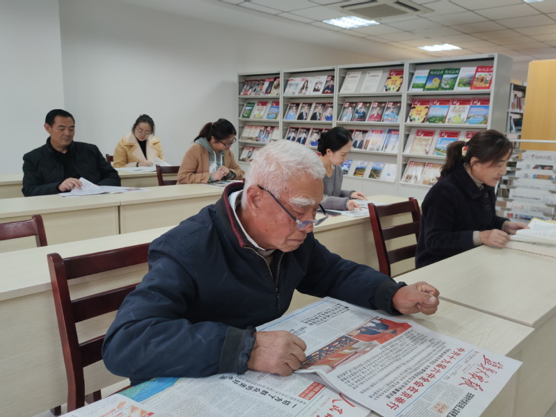 各基层党支部即日起迅速以各种形式,掀起对六中全会精神进行学习讨论和深化吸收。淮海农场社区充分发挥新时代文明实践所的学习平台地位,经常更新并充实职工书屋的书报藏书量,引导职工居民紧跟时代脉搏充电学习。图为11月12日下午,几名职工居民第一时间在书屋内认真观看刊有党的十九届六中全会精神的报纸。