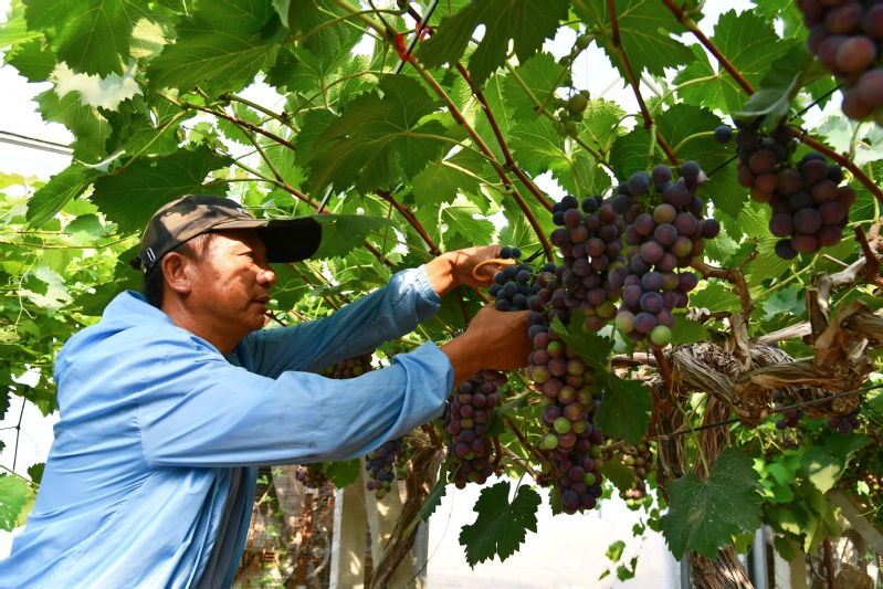 7月21日,走进淮海农场葡萄园,工人们正给订货客户采摘葡萄。园区种植夏黑、阳光玫瑰、甬优等品种,随着葡萄逐步成熟,订货客户源源不断。